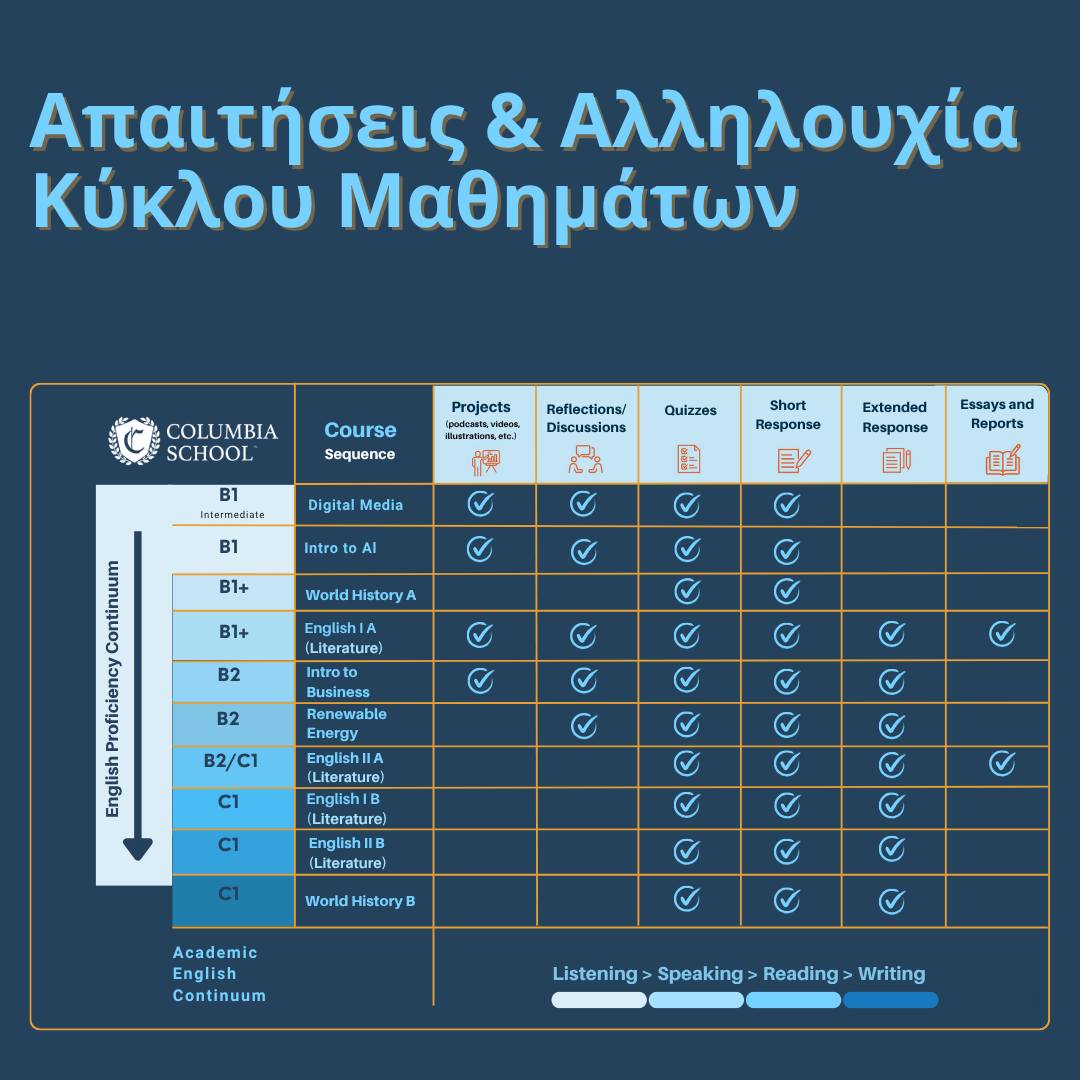 Το πρόγραμμα Columbia School Dual Diploma ακολουθεί μια σαφή αλληλουχία μαθημάτων, η οποία συνδυάζει την ενίσχυση της αγγλικής γλώσσας με την ανάπτυξη ακαδημαϊκών δεξιοτήτων.